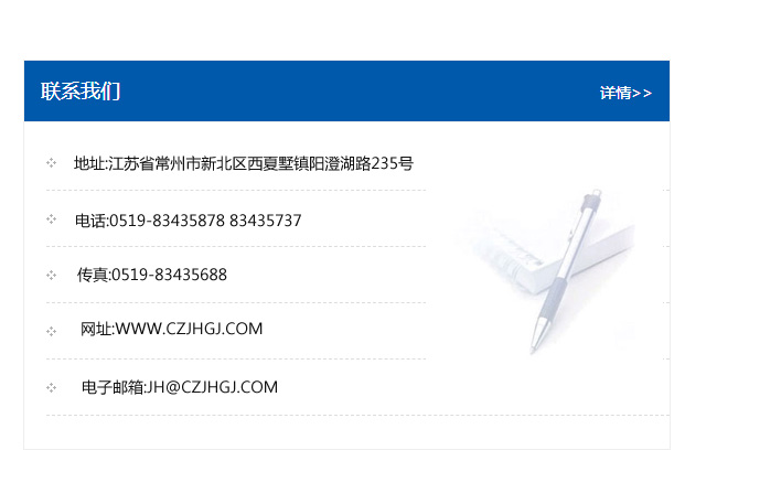 傳真:0519-83435688    郵編:213135    網址:WWW.czjhgj_com.wfqcc.com    電子郵箱:JH@czjhgj_com.wfqcc.com